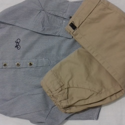 Ensemble short kaki et chemise bleu ciel rayée